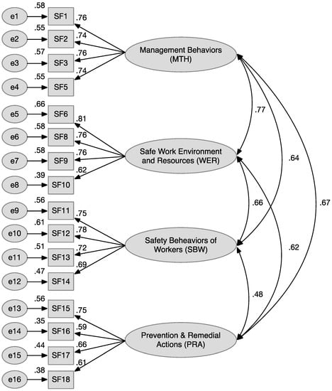 Table 2 provides the post varimax rotation results. This new description avoids confusion among extracted SFs. Four clusters are selected, based on the Kaiser rule for the extraction of clusters with eigenvalues greater than 1. The four clusters were named according to the SFs which form them. The four clusters are Management Behaviors (MTH), Safe Work Environment and Resources (WER), Safety Behaviors of Workers (SBW), and Prevention and Remedial Actions (PRA), respectively. Each of the SFs were strongly associated with a single clusters, where factors with a loading over 0.5 (to round off) were retained. The absence of factor cross loading indicates that the questionnaires displayed robust convergent validity. The Cronbach’s α values for the four clusters exceeded 0.74. Finally, the PCA clusters extracted accounted for 63.45% of the total variance.