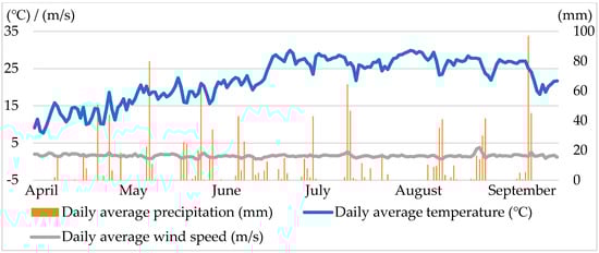 Personal information has been widely used in similar research to determine the impact of travel distance [29,32]. Most participants except two are either working for private companies, such as car manufacturers or for nonprofit organizations (NPO) such as a government office. Daily information that differentiates between weekdays and the weekend was also used in some research [42]. The trips in the weekday are here considered roughly as commuting, and the trips at the weekend are considered as other leisure trips. Even though commuting trips mostly have a certain origin and destination, small changes in route choice could lead to different driving distances. Leisure trips, on the other hand, are more flexible and dependent on variables such as the attractiveness of the destination. However, the weather condition was not included in previous studies. In addition to the alternative covariates above, we introduced the daily weather information—specifically, the average temperature, average precipitation, and average wind speed, as shown in Figure 1.
