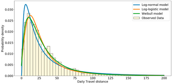 To develop the model gradually, we first start with a distribution test for the daily travel distance. As mentioned above, we assume lognormal, log-logistic, and Weibull distributions. The estimated parameters are listed in Table 2, and the distribution shapes are shown in Figure 2. To clearly show the distribution shapes of the three models, Figure 2 only presents daily travel distances within 200 km, which comprise 98.62% of the whole data set. Based on the log-likelihood and the graph of distributions, the log-logistic model clearly fits the observed daily travel distance the best. The shape of the lognormal model is similar to that of the log-logistic model. The peak of the lognormal model is beyond the observed peak, and the peak of the Weibull model is a little bit short compared to the observed peak. The 95% quantile of daily travel distance for each distribution is 90 km for Weibull, 103 km for log-logistic, and 129 km for lognormal. Thus, we can assume that electric vehicles with a driving range larger than 103 km could fulfill the driving demand of our participants, and [43] mentioned 57 types of EV; only 3 of them cannot reach the need of our study. However, clearly people still have different preferences regarding the driving distance, and some people may be more adaptable to EVs, considering the battery range.