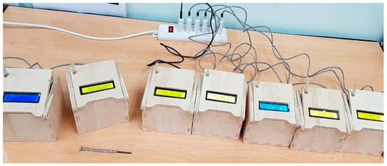 For indoor air pollution (PM2.5) and temperature (°C) measurements, the research team created 12 small devices (see Figure 1). The following components were used for its construction: an Arduino UNO microcontroller (Arduino ltd. Boston, Massachussetts, USA) with an Secure Digital (SD) card to store data and a 16 × 2 Liquid Cristal Display (LCD) for visualization, a real-time clock (RTC DS3231, Maxim Integrated, San Jose, CA, USA), and particulate matter (Nova SDS011, Geekcreit ltd. Bejin, China), temperature (DS18B20 with external cover, Maxim Integrated, San Jose, California, USA), and humidity (DHT11, Aosong Electronics Co., ldt., Guangzhou, China) sensors. The SDS011 sensor has been widely used as a low-cost option to measure air pollution in urban areas, showing acceptable reliability levels in indoor environments, especially regarding PM2.5 measures in high-pollution environments [74,75]. The SDS011 laser scattering detects the concentrations of particles between 0.3 to 10 μm in size in the air with a resolution of 0.3 μg/m3 and a relative error of 10% [76]. This sensor works in an environment with humidity up to 70%, which is suitable for indoor measurements. In addition, reliability tests were performed to verify that all devices reported similar measures when they were switched on simultaneously.