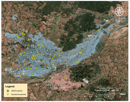- Jorquera, H.; Barraza, F.; Heyer, J.; Valdivia, G.; Schiappacasse, L.N.; Montoya, L.D. Indoor PM2.5 in an urban zone with heavy wood smoke pollution: The case of Temuco, Chile. Environ. Pollut. 2018, 236, 477–487. [Google Scholar] [CrossRef] [PubMed]