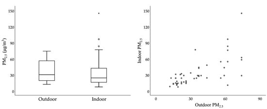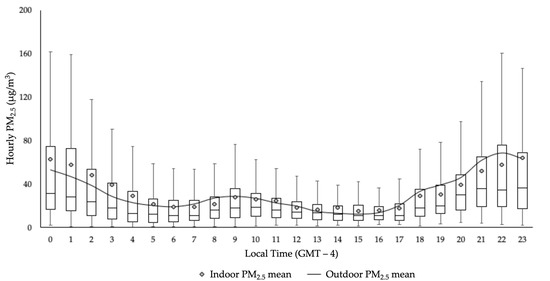 Figure 4 shows the boxplots of the outdoor and indoor PM2.5 concentrations depicting the hourly variability of data. Results show that the means of the indoor and outdoor air pollution followed very similar patterns and varied in terms of the activity in the home. In both cases, the PM2.5 concentration levels were higher between 6 p.m. and 12 p.m. (local time) when cooking and heating were frequent indoor activities.
