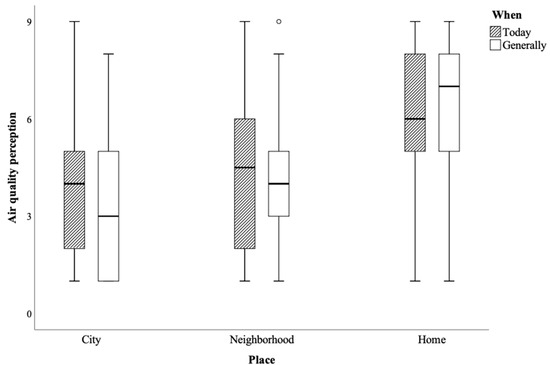 As shown in Figure 5, the study participants tended to provide a more positive evaluation of the indoor air quality relative to the outdoor air quality (city and neighborhood level), either on the day of measurement or in general. On a scale from 1 to 9, the average evaluation of the general air quality was 6.26 (SD = 1.98) for indoor air quality, 3.97 (SD = 1.90) for outdoor neighborhood air quality, and 3.25 (SD = 1.96) for the city.