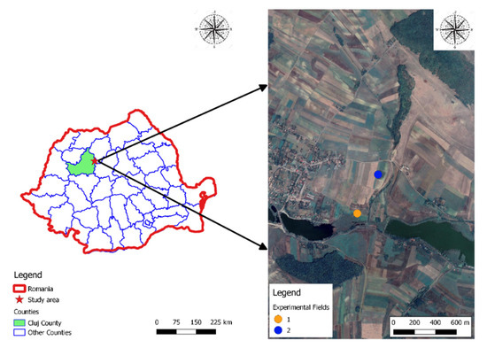 Study area and experimental field location (Geaca Municipality, Cluj District, Romania).