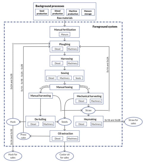In the scenarios Sc2A and Sc2B involving castor mechanical harvesting, castor husk has always been considered incorporated into the soil because it was discharged on the ground by the combine harvester as residue and not collected. Castor straw is a residue with an LHV of 17.68 MJ/kg and an ash content of 1.70 wt% [20]. For this reason, both manual and mechanical harvesting scenarios have been considered, both sold as solid biofuel (Sc1B and Sc2B) and incorporated into the soil (Sc1A and Sc2A). According to the farmer, press cake that resulted during the oil extraction phase is used as fertilizer and for this reason was always considered incorporated into the soil. Castor oil is the main product in the supply chain, and it has always been considered as sold.