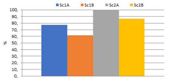 Although, in Sc1A and Sc1B scenarios, there is the de-hulling phase that there is not in Sc2A and Sc2B, this has a very small impact always <8% (on average 0.698 Mg CO2eq Mg−1 of castor oil produced) of the total CO2 emissions. The oil extraction impacted less than 5% of the total CO2 emitted (on average 0.412 Mg CO2eq Mg−1 of castor oil). Sanz Requena (2010) reported that for each ton of crude sunflower, rapeseed, and soybean oil extracted, an average of 2.2 Mg of CO2 was emitted, but it should be highlighted that after the mechanical extraction, a treatment with a solvent (hexane) was included [54].