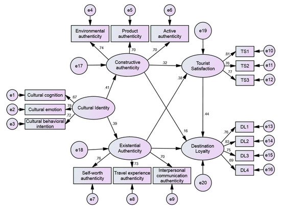 The proposed structural equation model (SEM) included structural and measurement models in which the former required the determination of the relationship between the latent and associated variables in advance. The structural model pertained to latent variables, which contained five elements, namely, cultural identity, constructive authenticity, existential authenticity, satisfaction, and loyalty. The relationship and role of each latent variable were marked for further verification. In SEM analysis, various latent variables can be used to measure items, such as cultural identity, constructive authenticity, and existential authenticity. The item can then be packaged into a new variable in the scale to reduce the structural equation complexity and to facilitate analysis [51]. Therefore, according to the factor analysis results of each relevant scale, the items for cultural identity, constructive authenticity, and existential authenticity were packaged as new variables in the SEM. Figure 4 displays the initial SEM, in which TS1-TS3 represent the measurement items of tourist satisfaction and DL1-DL4 represent the measurement items of destination loyalty.