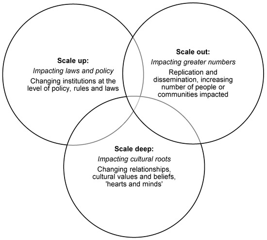 Scaling ‘up’ seeks to influence laws and policies; scaling ‘deep’ to produce an impact on cultural roots; scaling ‘out’ to achieve geographical replication and dissemination [60]. Each type of scaling involves specific strategies, such as advocacy efforts (i.e., for scaling up), storytelling to shift norms and beliefs (i.e., for scaling deep) and adaptation to different contexts (i.e., for scaling out). Beside this triple approach, cross-cutting strategies for scaling include making scale a conscious choice, analysing root causes and clarifying purpose, building networks and partnerships, seeking new resources, commitment to evaluation and institutional resources [60].