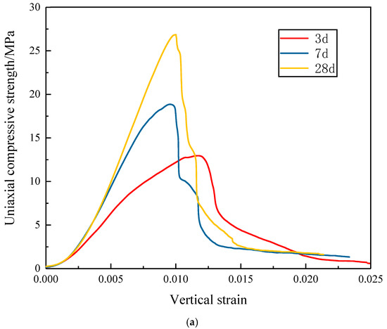 For a complete analysis of the strength of the support at different curing ages, uniaxial compressive strength tests were conducted, and the results are shown in Figure 3.