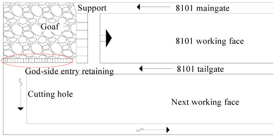 Gob-side entry retaining involves the preservation of the entire tailgate of the previous working face for use in the next one [1,2,3]. This allows for the utilization of a single roadway for two working faces. The key feature of this technology is the construction of a wall (also termed roadway side) to replace the traditional method of retaining coal pillars at the end support and along the working face [4,5,6]. The constructed wall that replaces the traditional coal pillar is employed for supporting the roof and isolating the goaf. This prevents air leakage from the goaf and provides the required support capacity. Accordingly, the side support of the roadway is preserved for the next working face. Consequently, the constructed roadway wall can form a transport roadway satisfying Y-type ventilation safety and production requirements. Concurrently, the wall’s structure must withstand the impact of the second overburden movement [7,8,9,10]. The gob-side entry retaining technology is characterized by direct significant effects including coal resources saving, investment benefit improvement, and mining life prolongation. In particular, its impacts on high-quality and rare resources are remarkable [11,12,13,14,15,16].