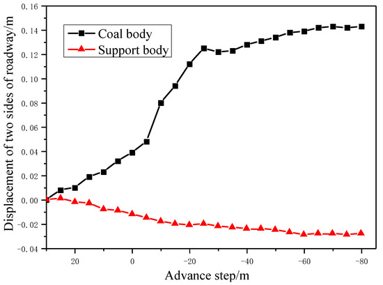 Figure 6 and Figure 7 reveal that the displacement of the coal body is larger than that of the support, with the entire deformation dominantly associated with the coal body. It is mainly because the strength of the support is greater than that of the coal body, with the coal body being prone to plastic damage and flow. At the corner of the roadway, especially, the support should be strengthened. At the corner of the roadway, especially, the support should be strengthened. From the beginning of monitoring to when the working face was pushed beyond 20 m from the monitoring point, the support exhibits an increasing trend with regard to displacement; when the working face exceeds 20 m from the monitoring point, the area around the support body is essentially stable. This demonstrates that the action of the rock beam on the support body remains constant after the working face attains stability. The displacement on the coal body side, however, increases rapidly in the early stage, stabilizes in the middle stage, and maintains the stability during the late stage.