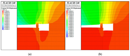 Vertical displacement associated with movement of the working face for (a) 5, (b) 10, (c) 20, (d) 40, (e) 60, and (f) 80 m.