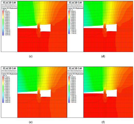 Changes in the horizontal displacement with the working face pushed to (a) 5, (b) 10, (c) 20, (d) 40, (e) 60, and (f) 80 m.