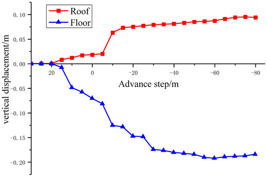 As the working face was moved over different distances (5, 10, 20, 40, 60 and 80 m), the movements along the horizontal direction (x-axis) were monitored, and the corresponding displacements are depicted in Figure 6.