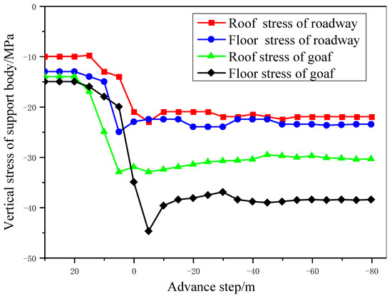 In the numerical simulation, the stress monitoring points were set at the upper and lower positions (top and bottom plates) of the support body, 30 m away from the working face, to monitor the vertical stresses on the left and right sides of the support body and subsequently analyze the support effects and stress changes. Some of the observations from this analysis are illustrated in Figure 10.