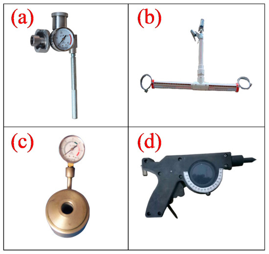 Test equipment: (a) single pillar dynamometer, (b) roof separation instrument, (c) bolt dynamometer and (d) measuring gun.