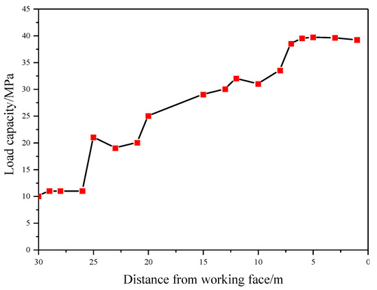 From Figure 12, it can be observed that the advanced support load significantly increases when the measuring point is 26.5 m away from the working face. Furthermore, when the working face is approximately 7 m from the working face, the single hydraulic prop reaches the maximum value (40 MPa). This demonstrates that the pressure at the advancing support changes significantly from 25 m from the working face.