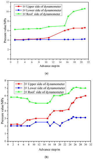 ZMC-IIA hydraulic bolt dynamometers were installed on the roof and sides of the roadway for detecting the stress states and their variations. This allowed for the monitoring of the bolt stress and assessment of the associated effects [46,47]. Six bolt dynamometers, positioned at 20 and 35 m along the roadway track (marked as #1 and #2, respectively) were installed on the upper side, lower side, and roof of the section. The pressure curves for the bolt dynamometers are depicted in Figure 14.