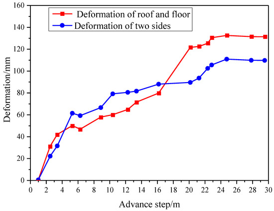 At an advance step of 1 m, it is observed that the roadway deformation (roof, floor, and two sides) begins to significantly increase. Following this, when pushed to 16 m, the deformation shows a rapid increase. The maximum cumulative movement of the roof and floor is 142 mm, while that for the two roadway sides is 120 mm. The values fall within an allowable movement range, thereby proving that the support can satisfy the normal production.