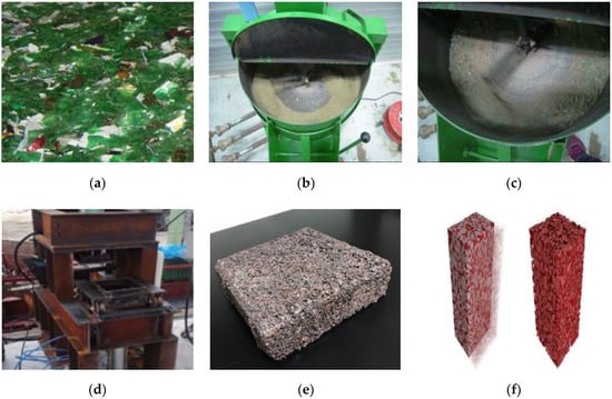 Overall procedure for recycled polyethylene terephthalate (PET) aggregate (RPA) block fabrication: (a) chopped PET chips; (b) aggregate heating; (c) RPA chips heated aggregate mixing; (d) shape molding with pressure; (e) fabricated RPA block; (f) X-ray CT profile of RPA block specimens.