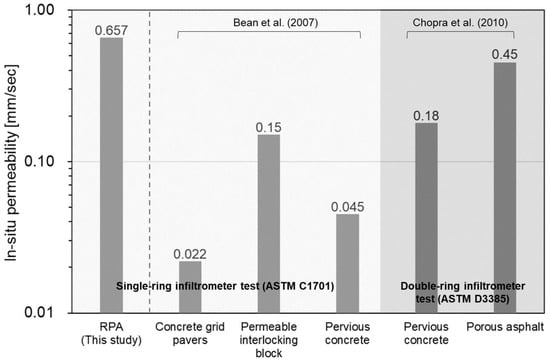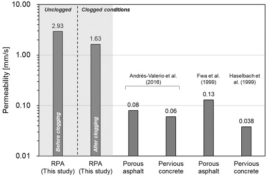 The nonclogged laboratory-based permeability (2.93 mm s−1) was higher than the in situ permeability because of the absence of an underlying soil layer, although this decreased to 1.63 mm s−1 with sand clogging. The sand-clogged permeability satisfies the minimum infiltration rate of 0.14 mm s−1 recommended by the US Interlocking Concrete Pavement Institute [31]. The sand-clogged permeability of the RPA blocks was also improved when compared to values reported in previous studies (Figure 4) [1,38,39], with lower maintenance (e.g., cleaning or vacuuming) requirements and cost as previously anticipated.