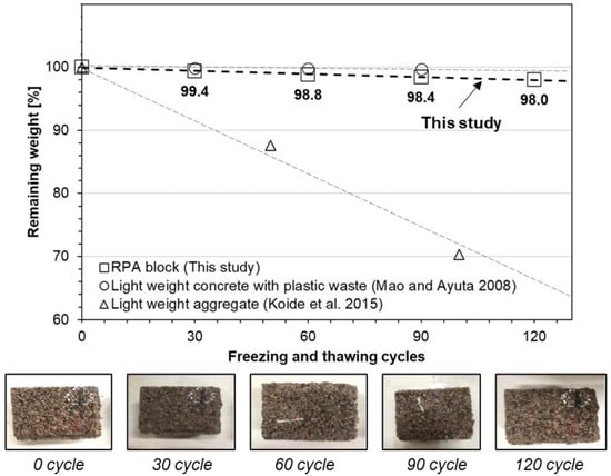 As the remaining mass of RPA blocks follows a linear reduction path, the remaining mass after 50 cycles is extrapolated to be 99.1%, which satisfies the weathering criteria (less than 1.0% per 50 cycles) for paving units (Table 1) [32]. The durability of RPA blocks is therefore adequate and at least comparable with those of lightweight aggregate and lightweight concrete involving recycled plastic-waste aggregate (Figure 5) [40,41]. Previous freeze–thaw studies of conventional and permeable pavers found that rubberized pervious concrete sustains a mass loss of 3.5% over 240 cycles, and plane concrete and clay-soil blocks sustain mass losses of 34.0% over 300 cycles and 0.7% over 28 cycles, respectively (Table 2) [42,43].