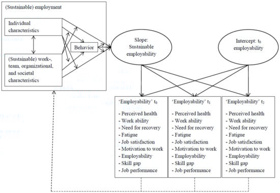 As the aforementioned nine indicators allow the ‘employability’ component to be captured, the ‘sustainability’ component of SE can be captured as well. As proposed, ‘employability’ can be considered sustainable if it does not decline-and preferably improves–over time. This suggests that if ‘employability’ has a positive or zero, but not a negative, developmental trajectory across multiple time points, it is sustainable over that specific period of time. Capturing development is essentially an issue of capturing change over time. As such, several techniques may be suitable, but we propose using latent growth curve modelling (LGCM) [122] to capture ‘employability’s’ developmental trajectory. In LGCM the intercept and slope of the ‘employability’ variable can be modeled as ‘latent’ variables that can be related to predictor- and/or outcome variables. The slope in an LGCM represents the linear (or quadratic or cubic to model non-linear growth) development over time, whereas the intercept represents the starting value of the variable (e.g., ‘employability’) at the first time point included. Then, relating potential predictors to the slope of ‘employability’ allows estimating their effects on the ‘sustainability of employability’, or rather, sustainable employability (SE). Thereby, the factors that promote SE can be identified, as is the goal of SE research.