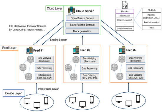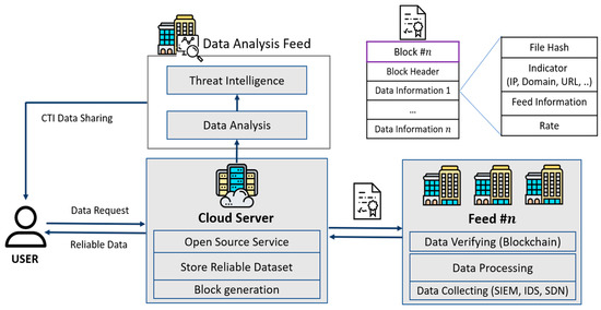 According to a computer security collaborative management study by Jean-Marc Seigneur and Adam Slagell, cyber threat intelligence collaborative security is defined, “Instead of centrally managed policies, organizations or nodes share and collect cybersecurity knowledge with other organizations or nodes, and security decisions can be made” [26]. As a result, Daire Homan et al. [27] proposed a model for sharing data securely without sharing personal information when sharing sensitive information using blockchain.