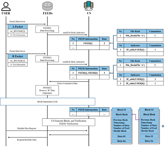Hash Collision: The model presented in this paper uses a hash function to communicate efficiently in a network environment where a lot of data is generated and communicated. Since the hash function has a problem of hash collision, which is an inherent problem, this problem may occur in the proposed model. First, time is not taken into account in the data collection stage for sharing threat information. Time to provide threat information is not an important consideration because it is intended to use threat information to change an organization’s security policy and protect against future cyber threats [39,40,41,42]. Therefore, the model proposed in this paper provides service after creating a dataset every 10 min, which is a block generation cycle. The purpose of the data collected for 10 min is to store information that can be the most threat from the information consumer’s perspective. Therefore, although there is a possibility of a hash collision among the recent data occurring for 10 min, it is very unlikely that both of the two files with the conflict will be highly reliable. However, when sending a hash value to solve the hash collision, if the transmission includes additional information such as the size of the file data, the possibility of a hash collision can be much lower. However, most feeds are rarely collecting both files that accidentally crashed as important. For example, when data B, having a rate of 1, collides with data A, having a rate of 50, the CS recognizes the same hash and determines it to be 51. In this case, we considered the efficiency of data communication because it does not mean whether A has a rate of 50 or 51 as a big change.