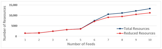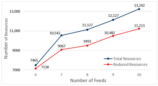 Figure 5 shows the resource reduction when the number of cooperating feeds is more than six. As the number of feeds increases, the total number of network resources increases, and data reduction can be seen by comparing the number of feeds to 6 and 10. These results show that the larger the system, the higher the resource reduction. As a result, when all 10 feeds that the experimental dataset is applied, the data resources are reduced by about 15.322% from a total of 13,242 data to 11,213 from a total network perspective.