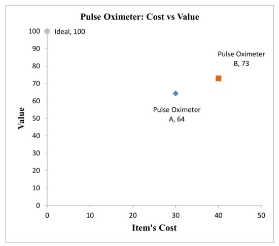 The cost is not a part of the model; the final results of the framework after scoring alternatives are the values of all the qualities/criteria. The results are presented in the form of a value/cost analysis, where the total value versus cost is plotted for both alternatives, along with the ideal choice; see Figure 5. There is a tradeoff between Oximeter B, with a potential value of 73 at the cost of $40, and Oximeter A, with a potential value of 64 at the cost of $30. The decision is now left to the value analysis team at the organization who should decide if the added value for Oximeter B, if used instead of A, deserves the additional price. In other words, does an additional value equal to 72.9 − 64.4 = 8.5 measure as desirable versus the extra $10? The value versus cost plot helps the decision-makers to identify the dominant and dominated alternatives. For example, if there was a third alternative with a value of less than 73 and a cost of more than $40, it would be dominated by B, and an immediate decision could be made to discard it from the discussions.