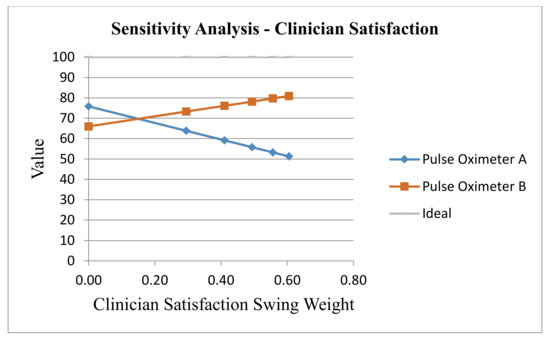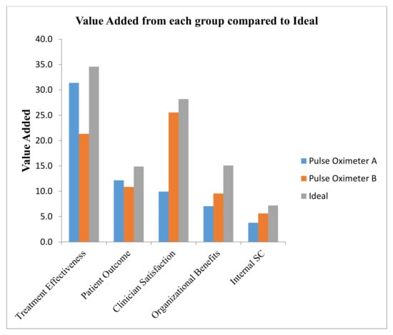Further analysis may be needed to look further into the value contribution from each V.M. category for each alternative for two reasons—first, to decide whether the additional value comes from a criteria category that matters more for the organization. The second is to investigate the possibilities of enhancing the cheaper alternative for a higher potential value. See Figure 6 for the five criteria categories values of both options, along with the ideal for comparison. The significant difference in value contribution comes from the “clinician satisfaction.” In other words, to boost the value of Oximeter A, the organization needs to focus on this category criteria and score higher for this alternative. Further analysis may be performed for any specific group for more in-depth details.