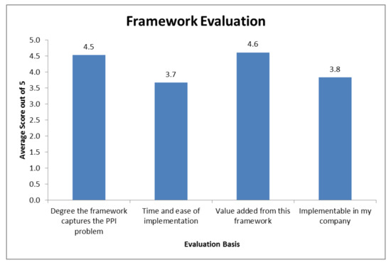All the questions were asked on a 1 to 5 Likert scale, where one means “I do not agree”, and five means “I strongly agree”. The 15 questions were classified into four groups, namely: the degree the framework captures the PPI problem, the time and ease of implementation, the value added from this framework, and if it is implementable in their companies. The framework evaluation is shown graphically in Figure 9.