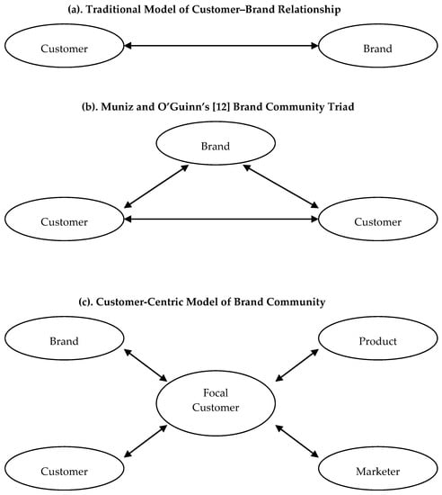 According to [8], the customer–brand relationship model (C/B) comprises only the customer and the brand (Figure 1a). Ref. [13], who envisioned brand communities as part of the customer–customer–brand (C/C) triad (Figure 1b), initiated the first model of brand community. The authors defined brand communities as “a specialized, non-geographically bound community, based on a structured set of social relationships among users of a brand.” Actually, in this study as well as other related studies regarding consumer collectives [14], [15] indicated that inter-customer relationships are an important element in the loyalty equation. However, [8] emphasized social relationships among customers but they felt the relationship was incomplete. The authors used other things that were related to brand communities to depict a customer-centric model (Figure 1c).
