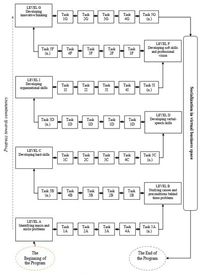 The distance learning framework proposed is a 6-month seven-level program that enables the acquisition of experience necessary for a successful career in a particular field. The knowledge is delivered in a group format where 20 to 100 participants gain practical experience and seek information to complete the task in the simulated context by aid of modern information resources and advanced smart technologies. Cohesive and interrelated tasks are given by a moderator via a 7 min instruction video and evaluated in a video conference format. The evaluation lasts not longer than 7 min. The distance learning framework is based on a project-based approach, meaning that each task has definite boundaries and evaluation criteria. Furthermore, learners are not permitted to move on to the next level of professional development if the current stage is not completed. Progress evaluation is performed prior and subsequently to each task is order to identify barriers to learning. Note that professional and personal development paths are integrated and take place through social interactions with other participants in the teaching and learning process, such as moderators, consultants, and mentors who communicate instructions and recommendations. All e-learning schedules are temporary decisions to address the needs of learners for convenient learning. The distance learning framework is designed for all ages and educational backgrounds. By the end of the training course, the learner is expected to establish a comprehensive business project that will be tested in a virtual business space. The education model under consideration provides for the consolidation of knowledge the learner acquires, personal and group progress analysis. Those who complete the course will receive a certificate at the end of the program that will meet the international standards for education. A universal model of distance learning is depicted in Figure 1.