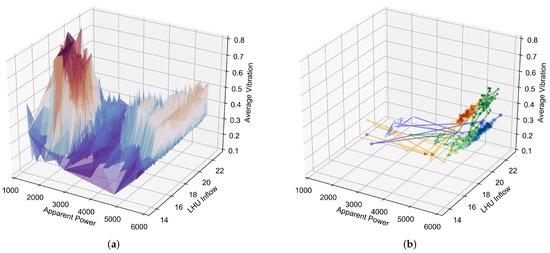 Figure 1 presents the interaction between the variables in the dataset, in two different visualizations. The vibration variables are replaced by the average of the variables at the different measuring points. Figure 1a indicates a low-apparent power region, where the average vibration is higher than in the rest of the observations. These present a transient period in which the generator unit operates with imbalanced water inflow inside the runner. In such a state, the wear damage to the system and the fault risks are more serious.
