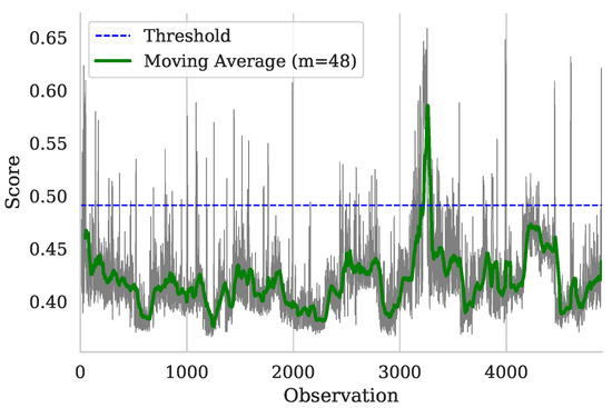 Figure 4 shows the anomaly score calculated using the EIF model for the entire test period. The moving average of the anomaly score illustrates that the observations are time-related, noting that the level of health tends to fluctuate over time. Factors like wear level, time of operation, maintenance, and shutdown directly impact the health index (HI).