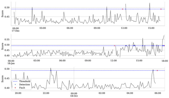 Analyzing some sample cases give us a better visualization of the model outcomes in practice. Figure 5 displays three selected time series excerpts, which comprise five faults out of the 59 registered in the dataset. iForest learned from the training set, and we analyzed the behavior of the model in a prominent failure situation. The s score represents the average count length of all iTrees. The threshold is set based on a confidence interval of 0.95. Every moment that the score exceeds the threshold is considered an anomaly. The actual anomalies are represented by red crosses, while the model detections are represented by blue dots. The observed excerpt periods are 17 December 2018, 18 January 2019, and 17 October 2018, respectively. Unconnected line periods represent missing data, which may occur when communication with the supervisory system is interrupted by network connection problems.