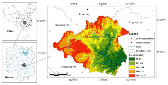 The Zhengshui River Basin covers an area of 3470 km2 and is located in Hunan province with longitude ranging from 111°53′ E to 112°37′ E and latitude ranging from 26°52′ N to 27°10′ N. The Zhengshui River is a first-order tributary of the Xiangjiang River and has a river length of 194 km. The river originates in the southeast of Shaodong county, flows through Shaoyang City, Loudi City and Hengyang City, and then converges into the Xiangjiang River at Hengyang City. The upper reaches of the basin are surrounded by mountains with a land area of 2720 km2 and accounting for about 71% of the total area of the basin. The middle and lower reaches of the basin are dominated by plains and lowlands with an area of 750 km2, accounting for about 20% of the total basin area. The remainder is the water area. The Zhengshui River Basin has a subtropical monsoon climate. The average temperature in July is above 29 °C. The annual precipitation is about 1300 mm, and is concentrated in the spring and summer, often arriving in the form of storms. The parent material of the soil in the river basin is sand-shale and granite, which is severely weathered. Soil erosion is severe and often creates blockages to river flow. The water resources in Zhengshui River Basin are currently at medium to high levels of utilization and cannot sustain further large-scale development [46]. There are seven weather stations within or close to the basin and two hydrological stations (Shenshantou station and Shimenkan station) (Figure 1). As the observed runoff data of the Shimenkan station are not complete, this study only used the Shenshantou station data for calibration and validation of the SWAT model.