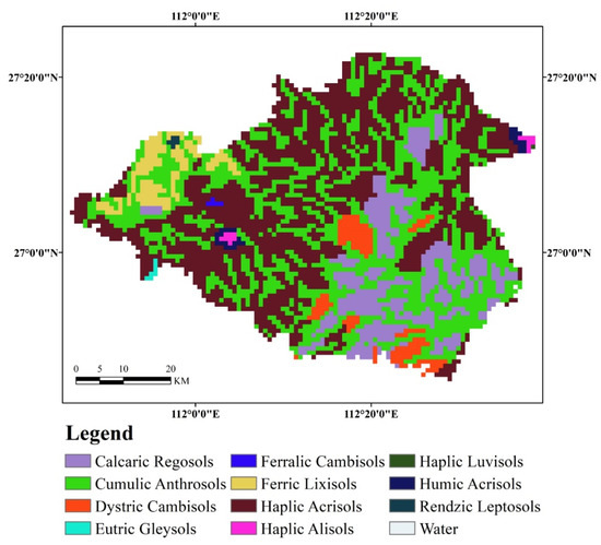 The map of soil types of the Zhengshui River Basin based on HWSD (Harmonized World Soil Database).