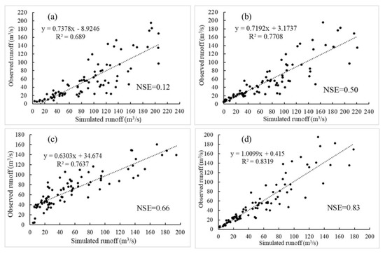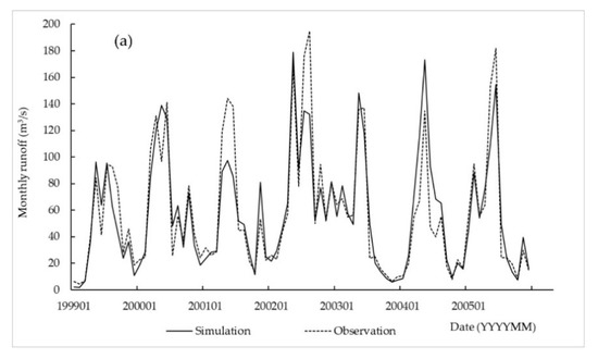 The NSE and R2 for the calibration period (1990 to 2005) were 0.83 and 0.83, respectively, and NSE and R2 were 0.84 and 0.83 for the validation period (2006–2013). Values of NSE and R2 were greater than 0.8, indicating satisfactory performance of the calibrated SWAT model. The comparison between simulated and observed monthly runoff values in the periods of calibration and validation confirmed that the simulated and observed values were closely aligned and that the model effectively simulated monthly runoff in the Zhengshui River Basin (Figure 3a,b).
