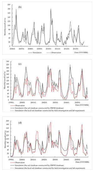 For the non-calibrated model, the simulated results showed that the monthly runoff based on the soil database derived from the HWSD database was higher than that based on the local soil dataset. The runoff predicted by both of the soil datasets was higher than the observed monthly runoff data (Figure 3c). NSE and R2 were used to compare the goodness-of-fit between simulated and observed data. The NSE values obtained were 0.50 and 0.12 for the soil database constructed by field investigation and laboratory experiment, and the soil database constructed from the HWSD database, respectively. The R2 values were 0.77 and 0.69, respectively (Figure 4a,b). Thus, the soil database constructed by field investigation and laboratory experiment predicted runoff reasonably well before calibration.