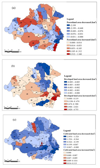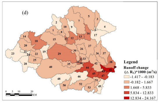 Considering that the area of cultivated land, developed land and forestland changed greatly from 1990 to 2010, the changes of these three land use types in each sub-basin and the change of runoff in each sub-basin caused by land use change were analyzed. The sub-basins with the most obvious increases in developed land area are concentrated in the downstream reaches of the river which include the most urbanized areas. The most significant increase of runoff in the basin also occurred downstream, which corresponds to the sub-basins where the area of developed land increased. In sub-basin 41, 44 and 47, the significant conversion of forestland and cultivated land to developed land, resulted in a significant increase in runoff. In sub-basin 49, the change of cultivated land and developed land area was small, so the increase of forestland area was identified as the strongest contributor for the decrease of runoff. In sub-basin 10 and 25, the change of forestland and developed land area was small, the area of cultivated land increased, and the runoff decreased (Figure 5). The increase of forestland area reduces runoff, while the increase of cultivated land and developed land leads to the increase of runoff.
