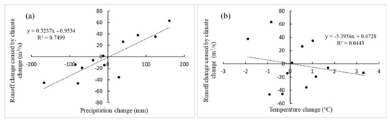 Relationship between (a) monthly precipitation change and simulated monthly runoff caused by climate change (∆RC); (b) Monthly temperature change and simulated monthly runoff caused by climate change (ΔRC).
