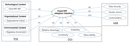 With this background, this study intends to provide insights into what factors should be considered regarding the adoption of cloud-based ERP. Based on the TOE, DOI, and MIR frameworks, a research model was developed to identify influential factors on intention to adopt cloud-based ERP. Specifically, a total of 10 characteristics are analyzed by classifying cloud-based ERP preference characteristics (i.e., information and communications technology (ICT) skill, organizational culture, regulatory environment, relative advantage, complexity, trialability, and observability) and resistance characteristics (i.e., data security, vendor lock-in, and customization) for this study.
