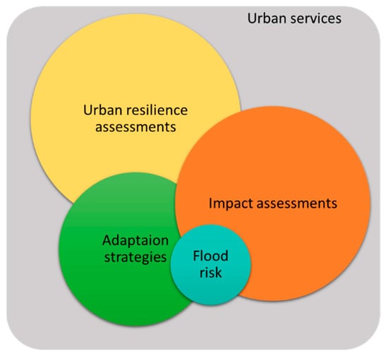 Due to the complexity of cities, urban resilience is a transversal and multi-sectorial issue, affecting different urban services, several hazards and all the steps of the risk management cycle. This is precisely why the topics contained in this Special Issue overlap (Figure 3), which is why all the papers presented deal with at least two of these topics (Table 1).