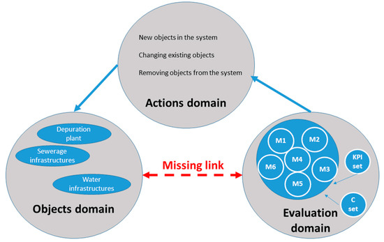 The Integrated Water System and the goal of this study: creating a link between the objects domain and the evaluation domain.