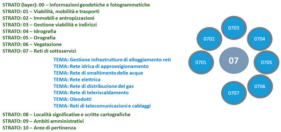 The first step of the adopted methodology consisted of identifying the objects. IWS was associated to the information layer “07,” which is divided into two themes (macro-classes), namely water supply network and water disposal network. Each theme embeds three classes, namely line, node, and network, as shown in Table 2. While the network class includes concepts referring to the network as a whole, the first two themes are associated to the geographic elementary units that outline the network.