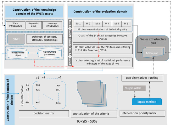 The methodology is first based on the construction of a knowledge model of the network, according to the specification of the National Federated Infrastructure Information Service (Sistema Informativo Nazionale Federato delle Infrastrutture—SINFI). Then, it selects the spatialized parameters that affect the intervention priority and establishes the link between the evaluation domain and the domain of IWS objects (Figure 1). The resulting index supports decision-makers in planning interventions and, at the same time, controls the IWS performances in terms of technical quality.