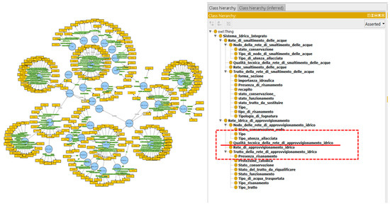 Starting from the content specifications of the information level 07, an ontology-based approach is carried out to create the hierarchy of two macro classes relating to the water supply network and the water disposal network. Subsequently, the membership relations between the IWS’s base objects (geometrically represented by arcs and nodes of a graph) and the identified classes with their attributes are built (Figure 4). The goal is to detect the objects and their properties on which planning interventions will act, and make explicit their impact on the performance indicators and their corresponding Mi macro-indicators.